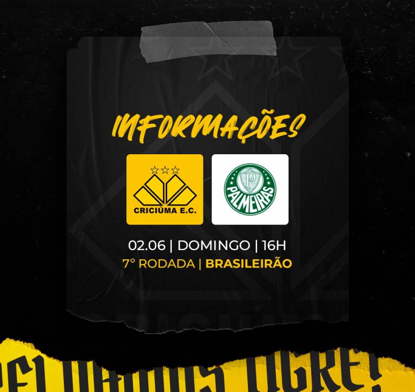 O torcedor que fez a compra do ingresso para o confronto entre Criciúma x Palmeiras, e deseja solicitar o reembolso do ingresso referente a partida válida pela 7° rodada da Série A do Campeonato Brasileiro, anteriormente marcado para o dia (19), agora remarcado para domingo (02/06) as 16 horas, tem o prazo definido para solicitar o reembolso até terça-feira (28). O processo para a solicitação do reembolso é através do site: www.minhaentrada.com.br/digitalizar-ingresso.