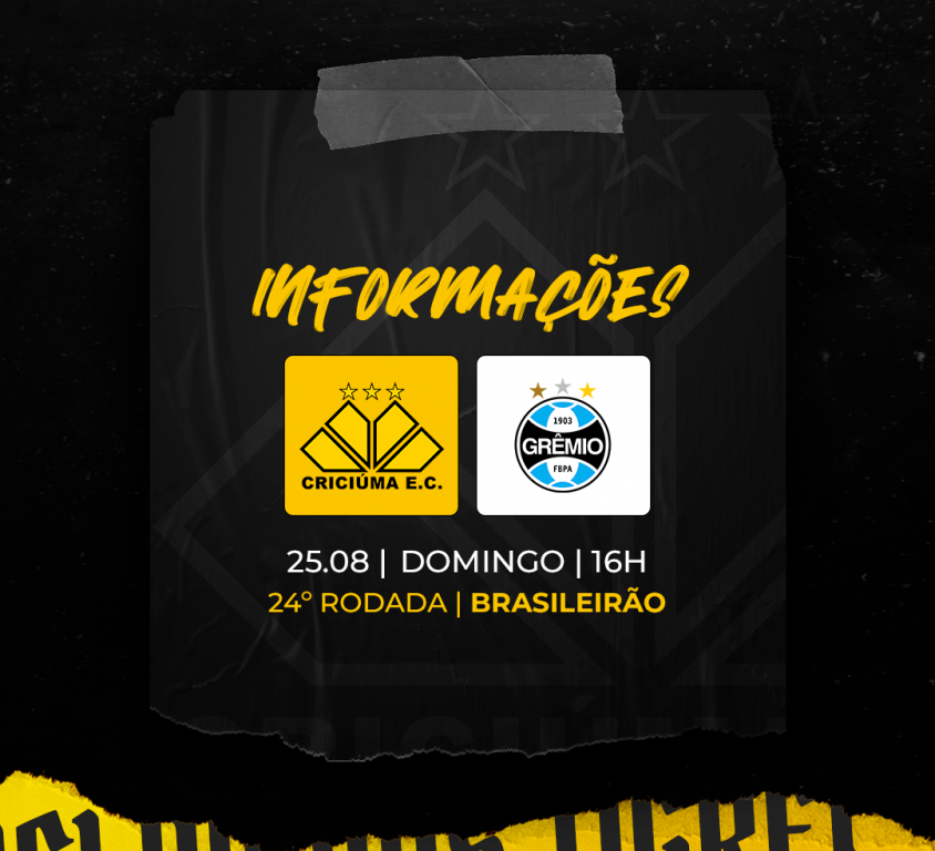 No próximo domingo (25/08), o Criciúma Esporte Clube enfrenta o Grêmio, pela 24ª rodada do Campeonato Brasileiro de Futebol. O confronto acontece às 16h, com a abertura dos portões às 14h.