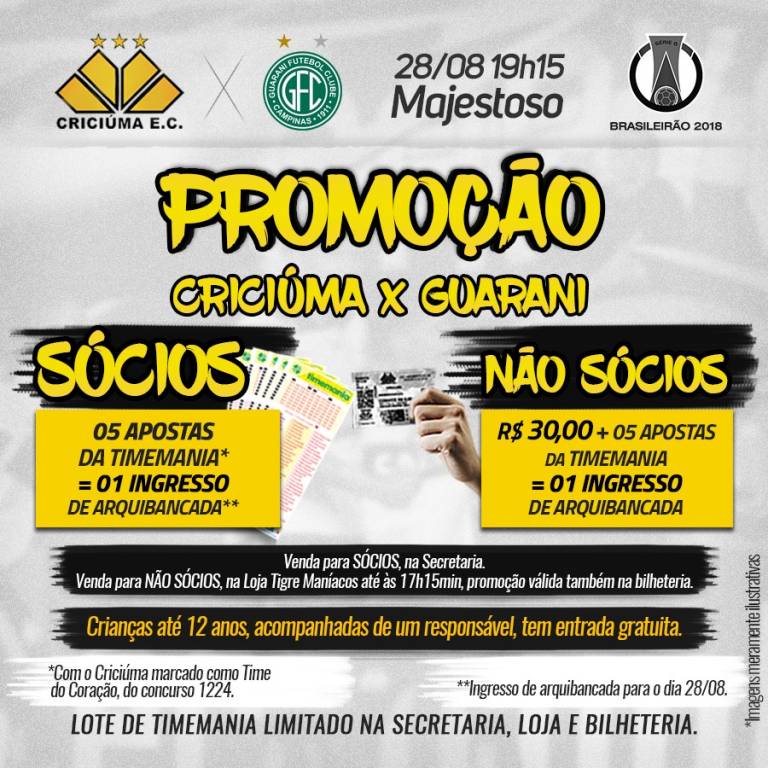 O Criciúma lança promoção de ingressos para o jogo desta terça-feira (28/08), às 19h15min, no estádio Heriberto Hülse, contra o Guarani (SP), pelo Campeonato Brasileiro da Série B. Há promoção para sócios ou não.