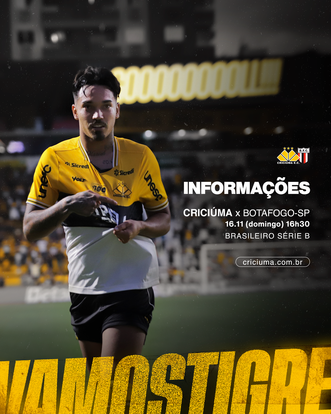 Nesse domingo (16/11), o Criciúma enfrenta o Botafogo SP, pela 37ª rodada da Série B do Campeonato Brasileiro. A partida começará às 16h30, com a abertura dos portões programada para às 14h. O ingresso de arquibancada inteiro custa R$100,00, enquanto a meia-entrada custa R$50,00 (válida para estudantes, pessoas com deficiência, idosos acima de 60 anos, entre outros, mediante comprovação conforme a legislação).