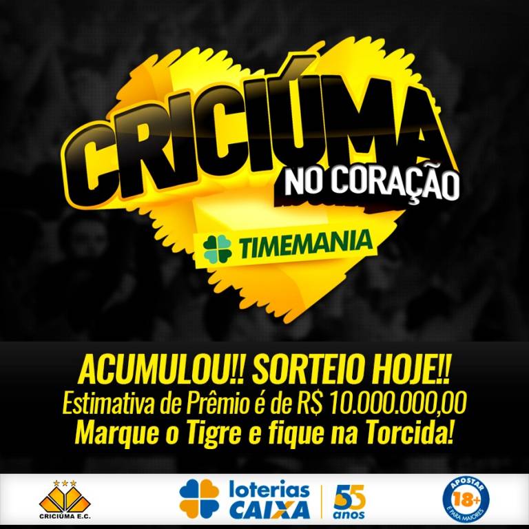 A Timemania contará com uma excelente premiação para esta quinta-feira (28/06). A loteria focada para os fãs de futebol está acumulada em R$ 10 milhões. O sorteio, válido pelo concurso 1198, será feito na noite desta quinta-feira (28/06). É possível ajudar o Criciúma na loteria marcando o Tigre como time do coração.
