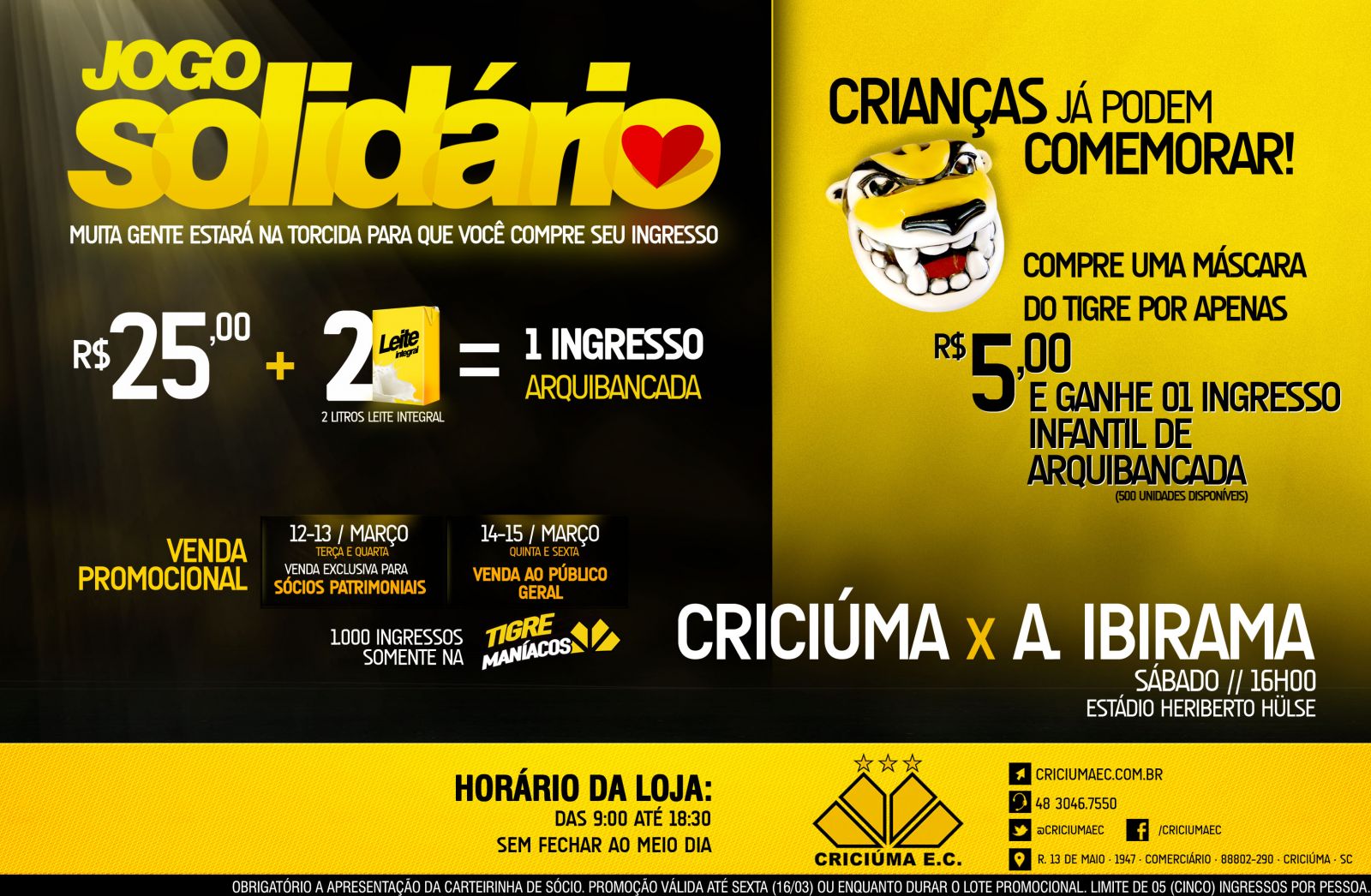 Ajudar ao próximo é o objetivo da primeira promoção de ingressos de 2013 para jogo do Criciúma. Para este sábado (16/03), às 16 horas, no estádio Heriberto Hülse, o Tigre encara o Atlético de Ibirama no ‘Jogo Solidário’. O torcedor poderá comprar ingresso com desconto e a aquisição da máscara do Tigre renderá entrada para a criançada.