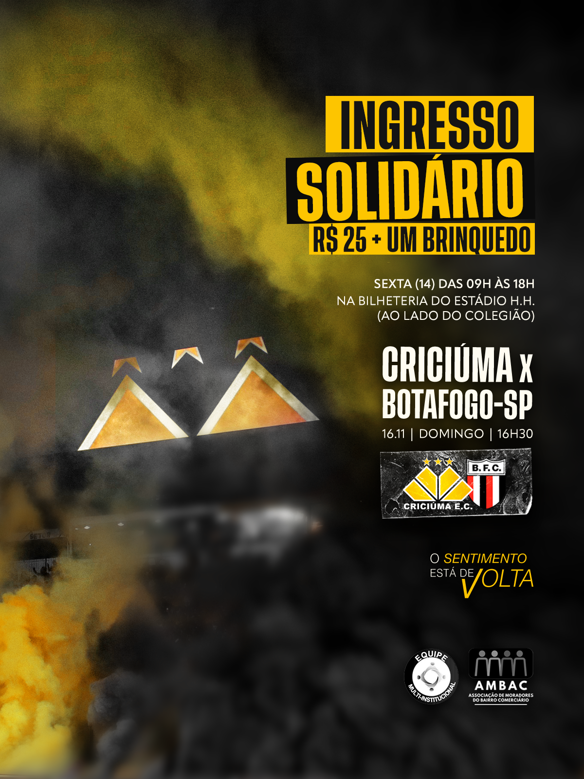 Serão disponibilizados 1.000 ingressos, no valor de R$ 25,00, que devem ser adquiridos acompanhados da doação de um brinquedo novo. Todos os ingressos são destinados ao setor de arquibancada. Ao participar, os torcedores ajudam diretamente crianças em situação de vulnerabilidade social.