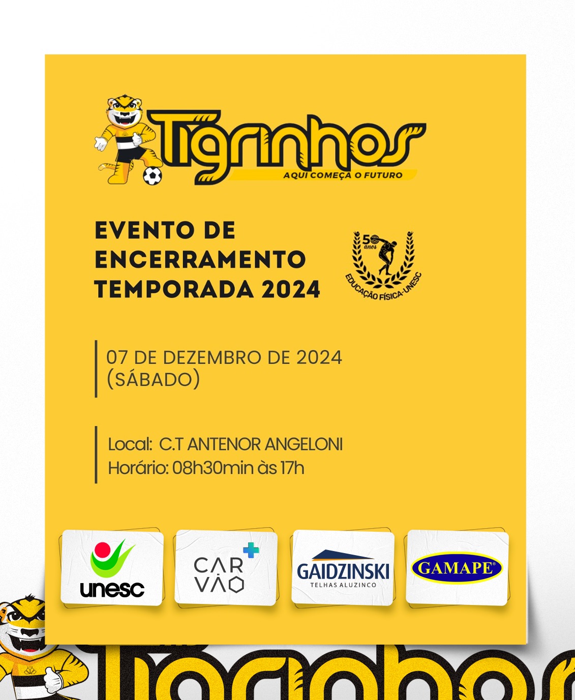 O CT Antenor Angeloni, será o centro do torneio de encerramento do ano de 2024 do Projeto Tigrinhos, que reunirá atletas Sub-12 e Sub-14. A competição ocorrerá no sábado (07/12), com a cerimônia de abertura marcada para às 8h30min. Ao todo, jovens atletas de 19 núcleos da região estarão presentes para disputar o título.