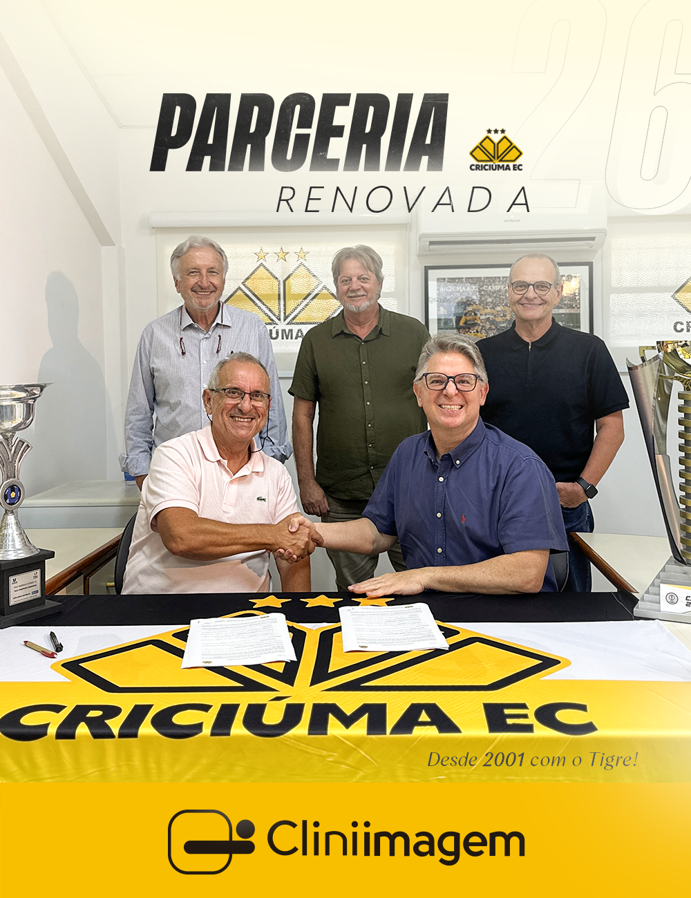 O Criciúma Esporte Clube oficializou a renovação da parceria com a Cliniimagem para a temporada de 2026. Parceira do clube desde 2001, a empresa mantém uma relação consolidada e histórica com o Tigre. A assinatura do contrato ocorreu na sala da presidência do estádio Heriberto Hulse.