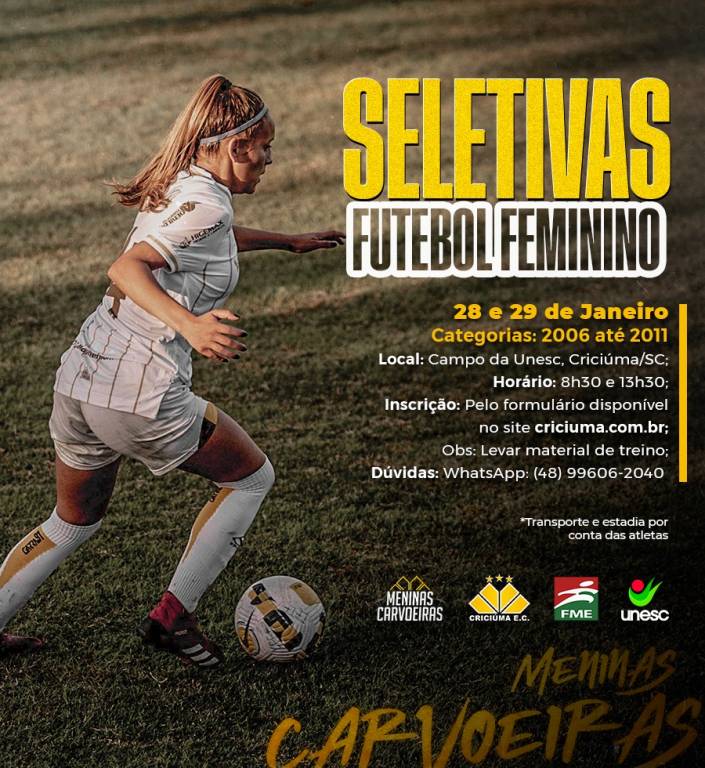 Buscando novos talentos no futebol e futsal feminino, o Criciúma realiza uma seletiva nos dias 28 e 29 de janeiro. As atividades acontecem na parte da manhã (futebol) a partir das 8h30, e no período da tarde (futsal), às 13h30, no Complexo Esportivo da Unesc (Universidade do Extremo Sul Catarinense), no bairro Universitário.