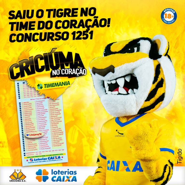 O Criciúma foi sorteado como o time do coração no concurso de número 1251 da Timemania, loteria da Caixa Econômica Federal. O sorteio foi realizado na noite desta quinta-feira (30/10). Ao todo, 3.694 apostaram no Tigre no concurso e ganharam R$ 5,00 por aposta.