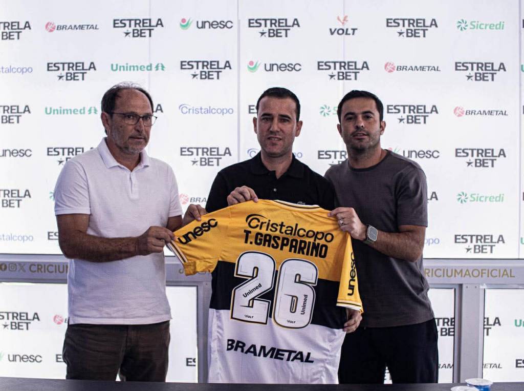O novo executivo de futebol do Criciúma, Thiago Gasparino, foi apresentado oficialmente na tarde desta quarta-feira (17/12). A coletiva ocorreu na Sala de Imprensa Setorista Márcio Cardoso, no Centro de Treinamento Antenor Angeloni. O profissional recebeu uma camisa do Tigre das mãos dos diretores Emerson Almeida e Eder Citadin e na sequência conversou com a imprensa presente sobre o novo desafio na carreira.