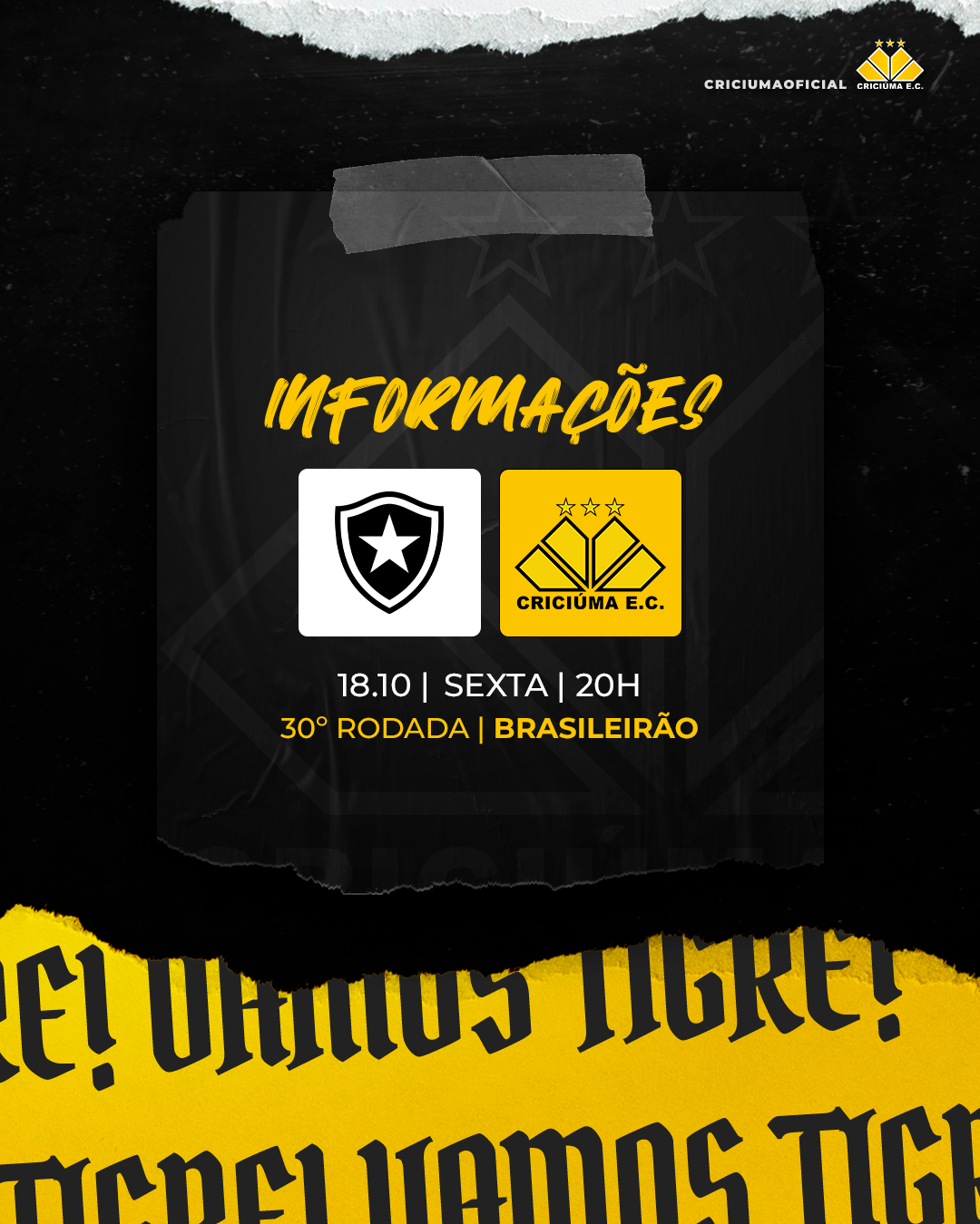 Os torcedores do Tigre que desejarem assistir a partida entre Botafogo x Criciúma, pela 30ª rodada do Campeonato Brasileiro, no próximo dia 18.10.24 (sexta-feira), no Maracanã - Rio de Janeiro, poderão adquirir ingressos no setor visitante, comprando on-line, no link: