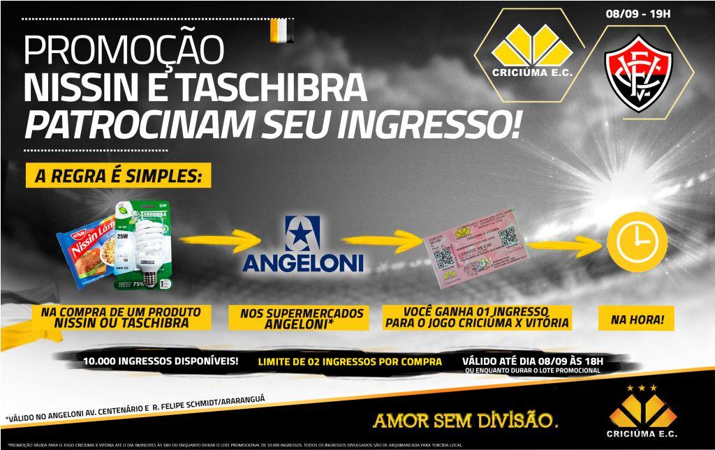 O Criciúma, em parceria com seus patrocinadores Nissin e Taschibra, lançou mais uma promoção de ingressos para a partida desta terça-feira (08/09) contra o Vitória. A partir da tarde desta sexta-feira (04/09), quem comprar um produto de uma das empresas nos supermercados Angeloni, ganha na hora uma entrada de arquibancada para o jogo. São 10 mil unidades disponíveis e a promoção vai até às 18 horas desta terça ou enquanto durar o estoque do lote promocional.