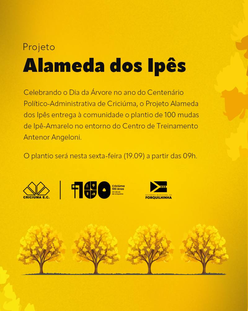 O Criciúma Esporte Clube, em parceria com o governo municipal de Criciúma e o Horto Florestal de Forquilhinha, promove no dia 19 de setembro o plantio de 100 mudas de ipês amarelos no Centro de Treinamento Antenor Angeloni. A ação marca as celebrações do Dia da Árvore (21/09) e do centenário de Criciúma, envolvendo torcedores, moradores da região e toda a comunidade.