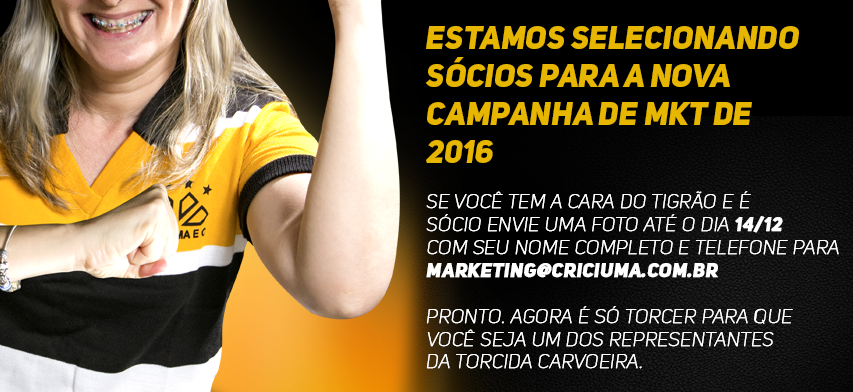 Os sócios em dia do Criciúma podem participar da nova campanha de marketing do Tigre para 2016. Para participar da seleção, é necessário enviar uma foto, mais o nome completo e número do telefone para o e-mail marketing@criciuma.com.br. Os associados precisam estar atentos a data limite. O prazo para o envio, que começou na última sexta-feira (11/12), se encerra à meia noite desta segunda-feira (14/12). Depois, o clube irá selecionar quem vai estar na próxima campanha e entrará em contato com os torcedores escolhidos.