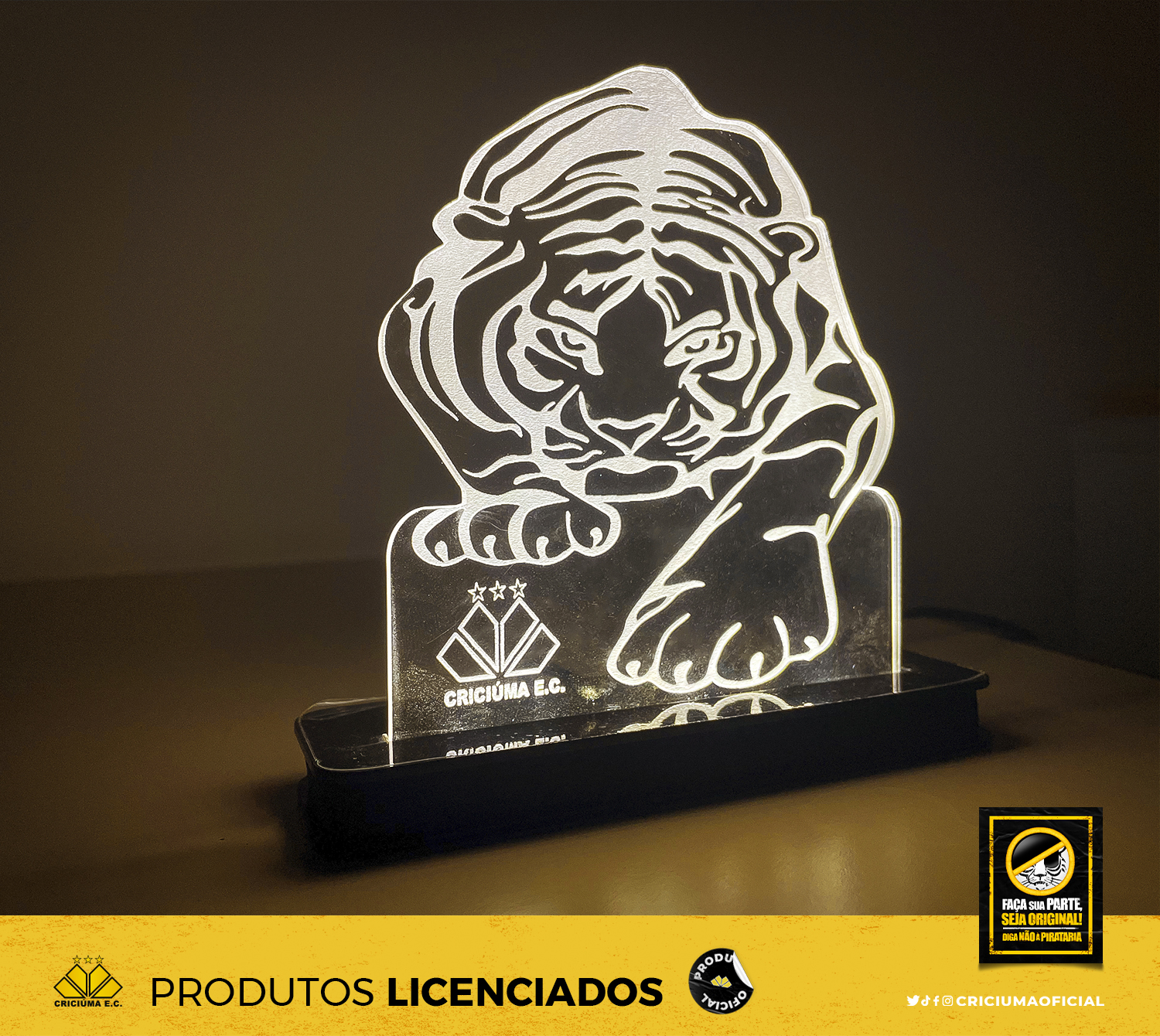 Para ter certeza de que você está levando um produto licenciado pelo Criciúma, procure o selo holográfico, indicando que aquele produto é oficial. O comércio ilegal e não-autorizado da marca aplicada em produtos, é crime. Portanto, denuncie sempre que encontrar alguém oferecendo qualquer mercadoria não-licenciada com a marca do Criciúma E.C.