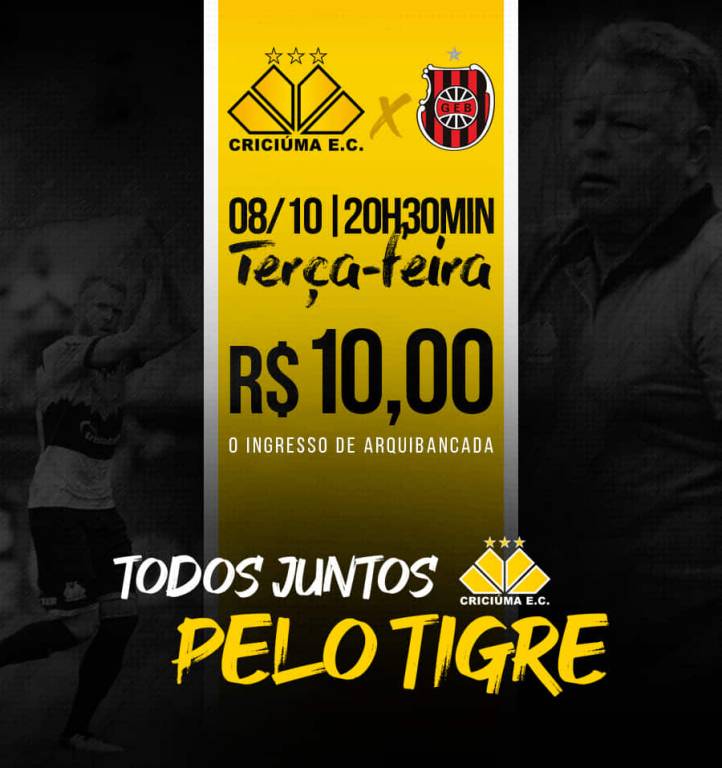 O Criciúma terá nesta terça-feira (08/10) mais um jogo importante pelo Campeonato Brasileiro da Série B e está se mobilizando para a reta final da competição. O Tigre preparou a campanha “Todos Juntos Pelo Tigre” para contar com o apoio da torcida carvoeira contra o Brasil de Pelotas. A partida válida pela 27ª rodada da competição nacional, ocorre às 20h30min, no estádio Heriberto Hülse.