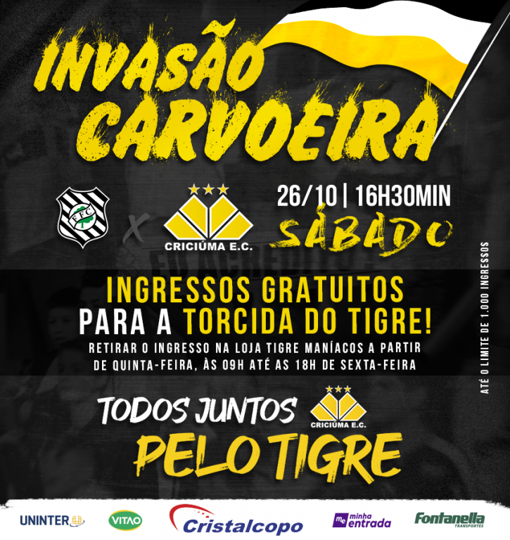 O Criciúma, em parceria com a Uninter, Vitao Alimentos, Cristalcopo, Minha Entrada, Fontanella Transportes e Dr. Arlindo Rocha, concretizaram nesta quarta-feira (23/10), a disponibilidade de ingressos de arquibancada para os torcedores do Tigre para a partida contra o Figueirense, em Florianópolis, no sábado (26/10). A “Invasão Carvoeira” é mais uma ação da campanha “Todos Juntos Pelo Tigre”. A partida válida pela 31ª rodada da Série B do Campeonato Brasileiro, ocorre às 16h30min, no estádio Orlando Scarpelli.