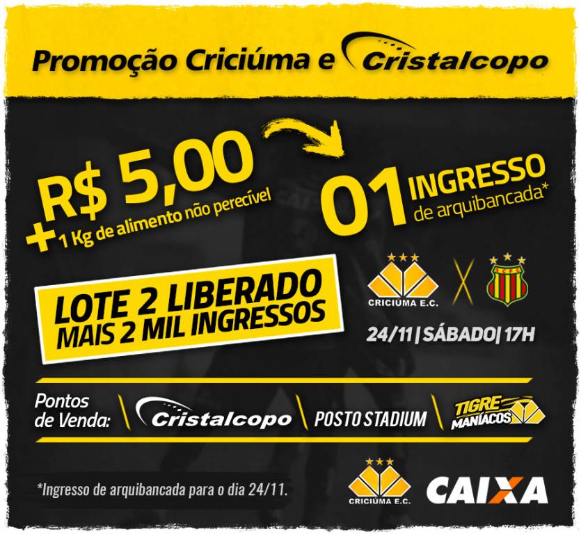Em uma parceria com a Cristalcopo, o Criciúma entrou com o segundo lote da promoção de ingressos para o jogo deste sábado (24/11), às 17 horas, contra o Sampaio Corrêa, no estádio Heriberto Hülse, pela 38ª rodada do Campeonato Brasileiro da Série B. Com a grande procura no primeiro lote, de 2 mil ingressos de arquibancada, o clube liberou mais duas mil entradas. O preço da entrada é de R$ 5,00 cada, mais um quilo de alimento não perecível.