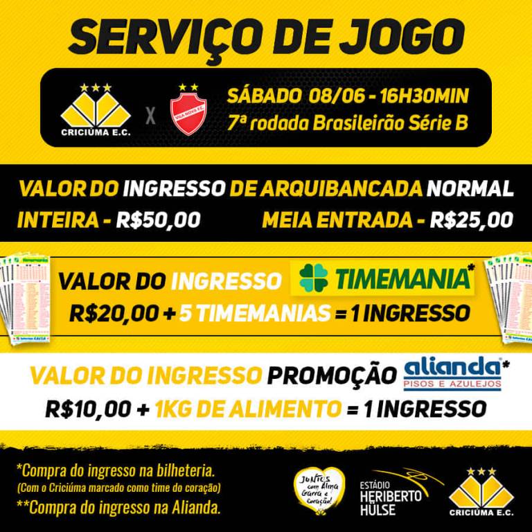 Segue a modalidade de ingressos para todos os jogos do Campeonato Brasileiro da Série B disputados no estádio Heriberto Hülse. Um lote de mil ingressos de arquibancada no valor de R$ 20,00 com mais cinco Timemanias marcando o Criciúma como Time do Coração estará disponível em cada jogo do Tigre no Majestoso. As Timemanias estarão disponíveis na secretaria anexa ao estádio. O horário de funcionamento será até o horário de início da partida. O clube lembra a importância de retirar o ingresso antecipadamente para evitar filas e que a secretaria não fecha ao meio dia.