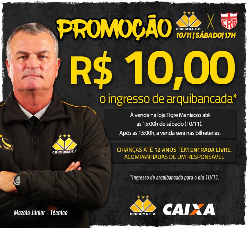 O Criciúma conta com uma promoção de ingressos para o jogo de sábado (10/11), às 17 horas, contra o CRB (AL), no estádio Heriberto Hülse, pelo Campeonato Brasileiro da Série B. O ingresso de arquibancada terá o valor de R$ 10,00.