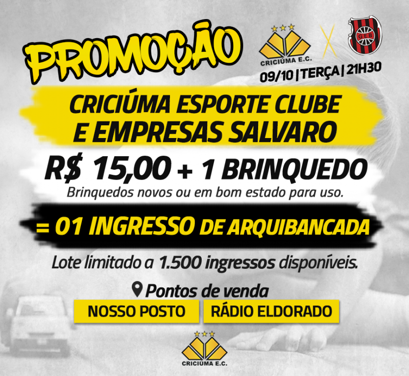 O Criciúma lançou uma promoção especial em parceria com as Empresas Salvaro para o jogo de terça-feira (09/10), às 21h30min, contra o Brasil de Pelotas, no estádio Heriberto Hülse, pelo Campeonato Brasileiro da Série B.