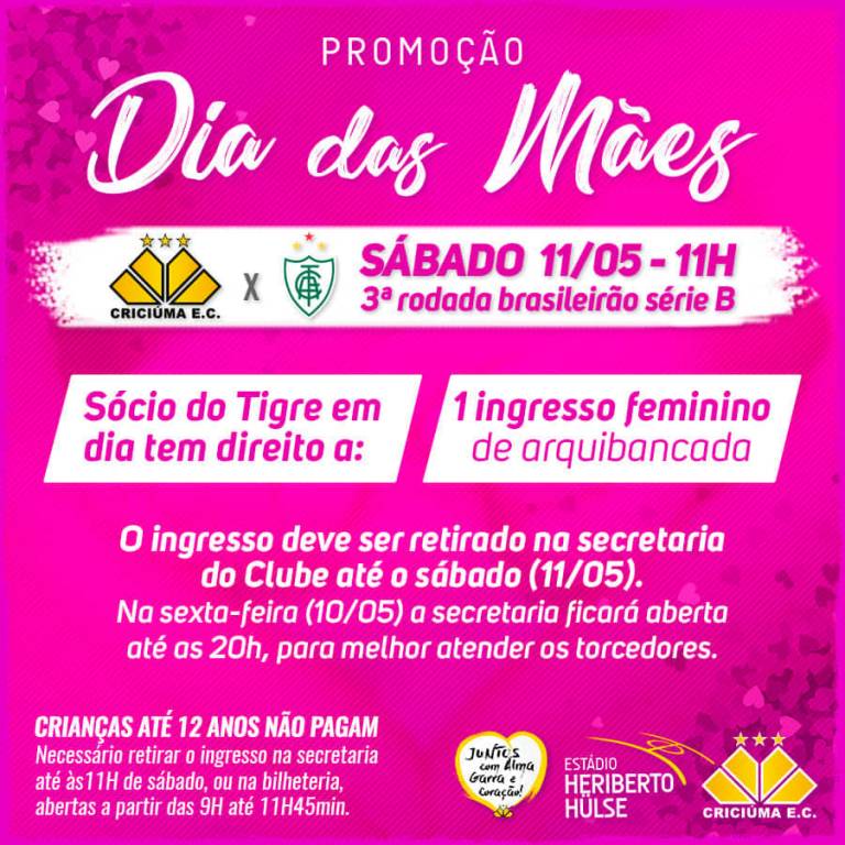 Em homenagem ao Dia das Mães, celebrado neste domingo (12/05), e em comemoração ao aniversário do clube, que será festejado na segunda-feira (13/05), o Criciúma lança uma promoção para as mulheres. Para o jogo deste sábado (11/05), contra o América Mineiro, todo sócio em dia poderá retirar um (1) ingresso feminino gratuito.