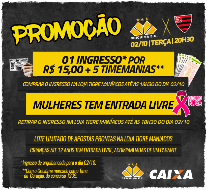 Além da promoção para as mulheres, os demais torcedores poderão comprar ingresso de arquibancada ao valor de R$ 15,00 mais cinco apostas na Timemania, marcando o Criciúma como equipe do coração no concurso 1239, que terá sorteio na noite de terça-feira (02/10). A premiação está acumulada em R$ 10 milhões. A promoção é válida até às 18h30min desta terça-feira. Há um lote limitado de apostas prontas na Loja Tigre Maníacos.
