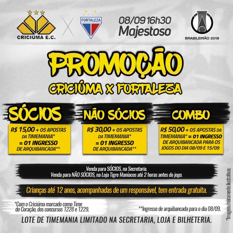 Para quem quer acompanhar os dois jogos dos próximos sábados, contra Fortaleza e Avaí, respectivamente, há um combo de ingressos promocionais. Por R$ 50,00 mais cinco apostas na Timemania marcando o Criciúma como equipe do coração nos concursos 1228 e 1229, o torcedor garante um ingresso de arquibancada para cada partida.