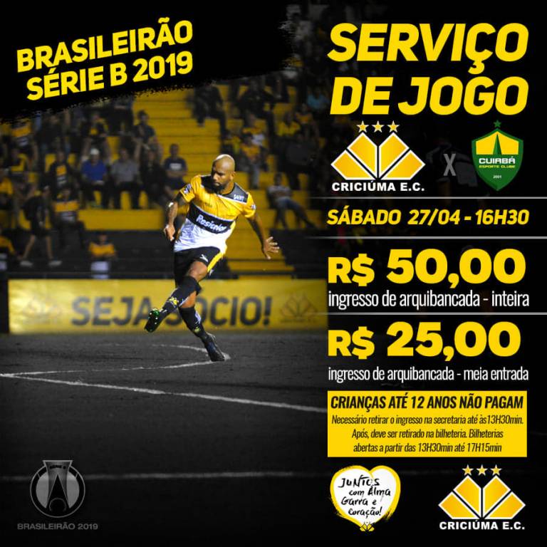 O Criciúma estreia na Série B do Campeonato Brasileiro neste sábado (27/04), às 16h30min, no estádio Heriberto Hülse. Para o confronto contra o Cuiabá, seguem as indicações no acesso ao campo para os torcedores.