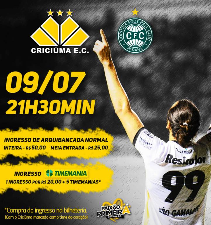 A modalidade de mil ingressos de arquibancada no valor de R$ 20,00 com mais cinco Timemanias marcando o Criciúma como Time do Coração também estará disponível para o torcedor.