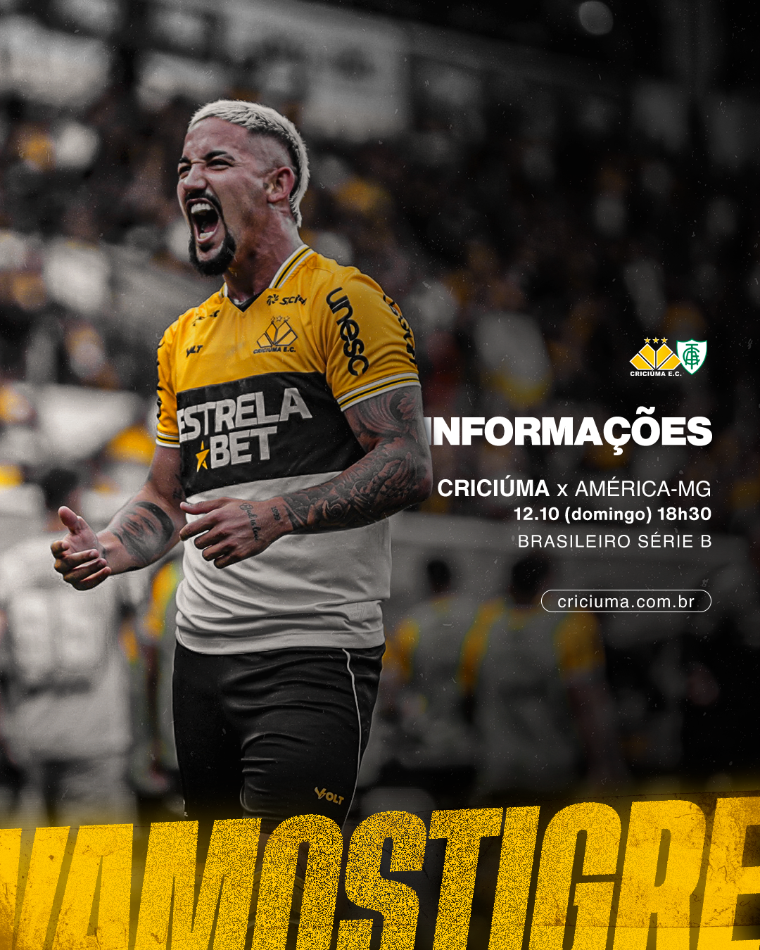 No domingo (12/10), o Criciúma enfrenta o América-MG, pela Série B do Campeonato Brasileiro. A partida começará às 18h30, com a abertura dos portões programada para às 16h30. O ingresso de arquibancada inteiro custa R$100,00, enquanto a meia-entrada custa R$50,00 (válida para estudantes, pessoas com deficiência, idosos acima de 60 anos, entre outros, mediante comprovação conforme a legislação).
