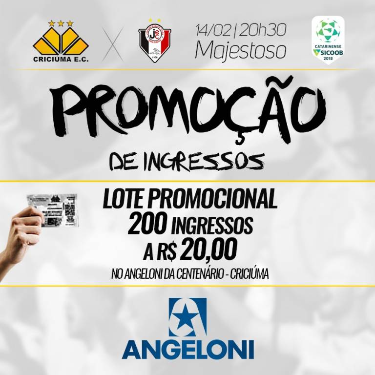Em uma parceria com o Supermercado Angeloni, o Criciúma lança promoção de ingressos para o jogo desta quarta-feira (14/02), às 20h30min, no estádio Heriberto Hülse, contra o Joinville, pelo Campeonato Catarinense 2018.