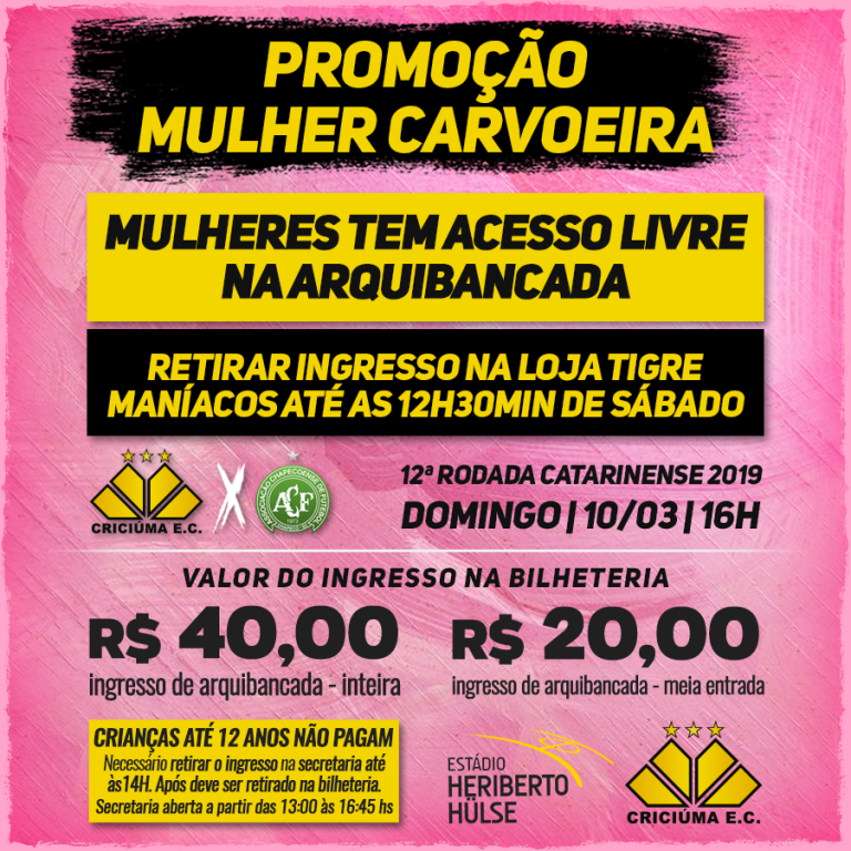 A partida, válida pela 12ª Rodada do Campeonato Catarinense, terá início às 16 horas no estádio Heriberto Hülse. Para ter acesso livre através dos portões 1, 4 e 5, as mulheres deverão retirar o seu ingresso gratuito na Loja Tigre Maníacos a partir desta sexta-feira (08/03), até às 12h30min de sábado (09/03).
