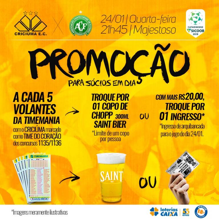 O Criciúma lança promoção de ingressos para o jogo de quarta-feira (24/01), às 21h45min, contra a Chapecoense, no estádio Heriberto Hülse, pela terceira rodada do Campeonato Catarinense. A promoção é exclusiva para associados em dia com o clube carvoeiro.