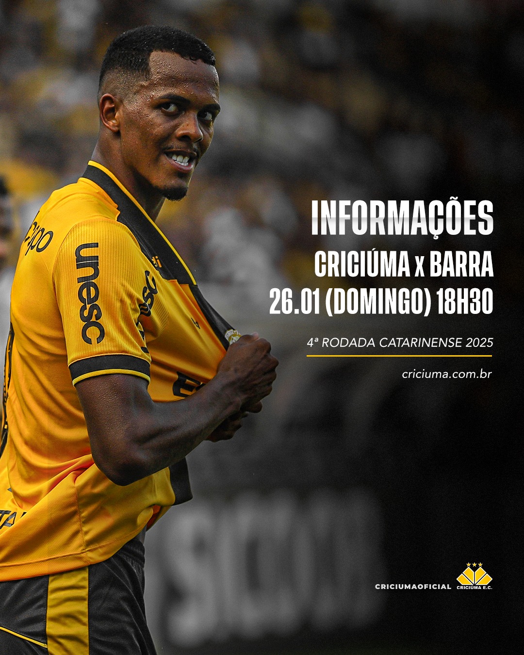 No domingo, (26/01) o Criciúma enfrentará o Barra pelo Campeonato Catarinense. A partida começará às 18h30, com a abertura dos portões programada para às 16h30. O ingresso de arquibancada inteiro custa R$ 50,00, enquanto a meia-entrada é R$ 25,00. A meia-entrada é válida para estudantes, pessoas com deficiência, idosos acima de 60 anos, entre outros, mediante comprovação conforme a legislação.