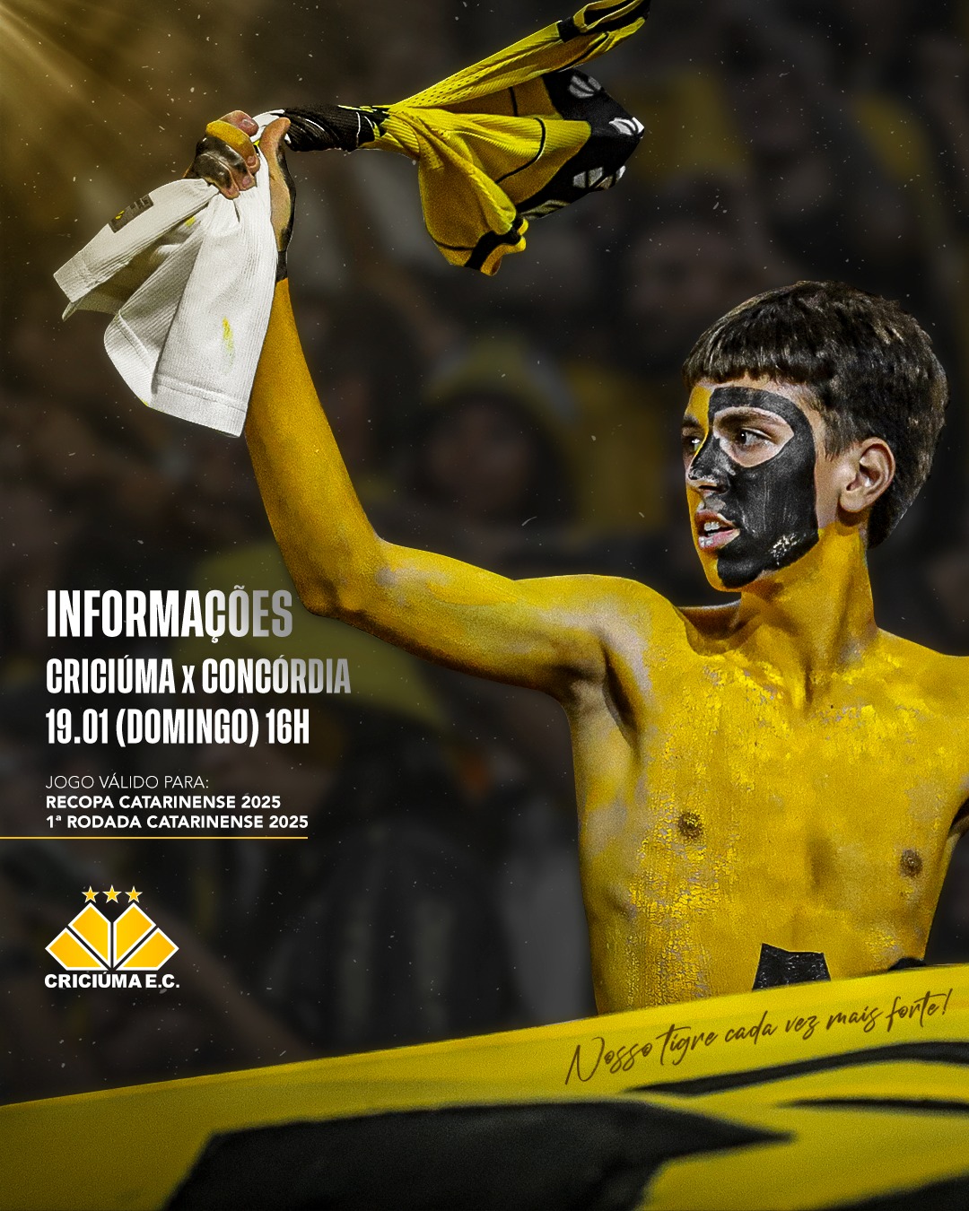 No próximo domingo (19/01), o Criciúma enfrenta o Concórdia, pelo Campeonato Catarinense de futebol, também valendo o título da Recopa Catarinense. O confronto acontece às 16h, com a abertura dos portões às 14h.