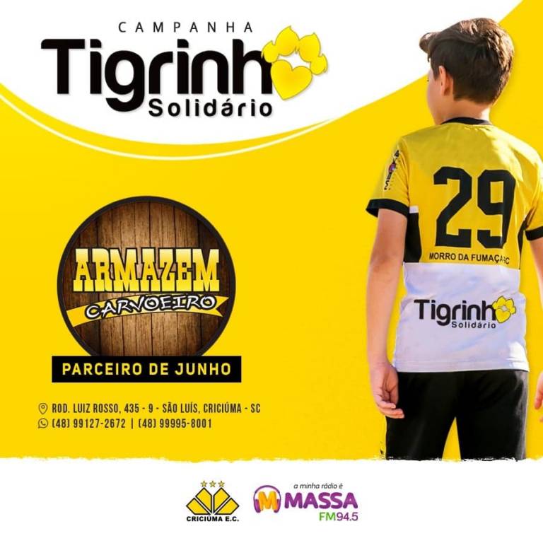O Criciúma, em parceria com a rádio Massa FM, segue com a Campanha Tigrinho Solidário neste ano de 2020. O Armazém Carvoeiro entrou como o novo parceiro do mês de junho. A assinatura ocorreu na manhã desta segunda-feira (01/06).