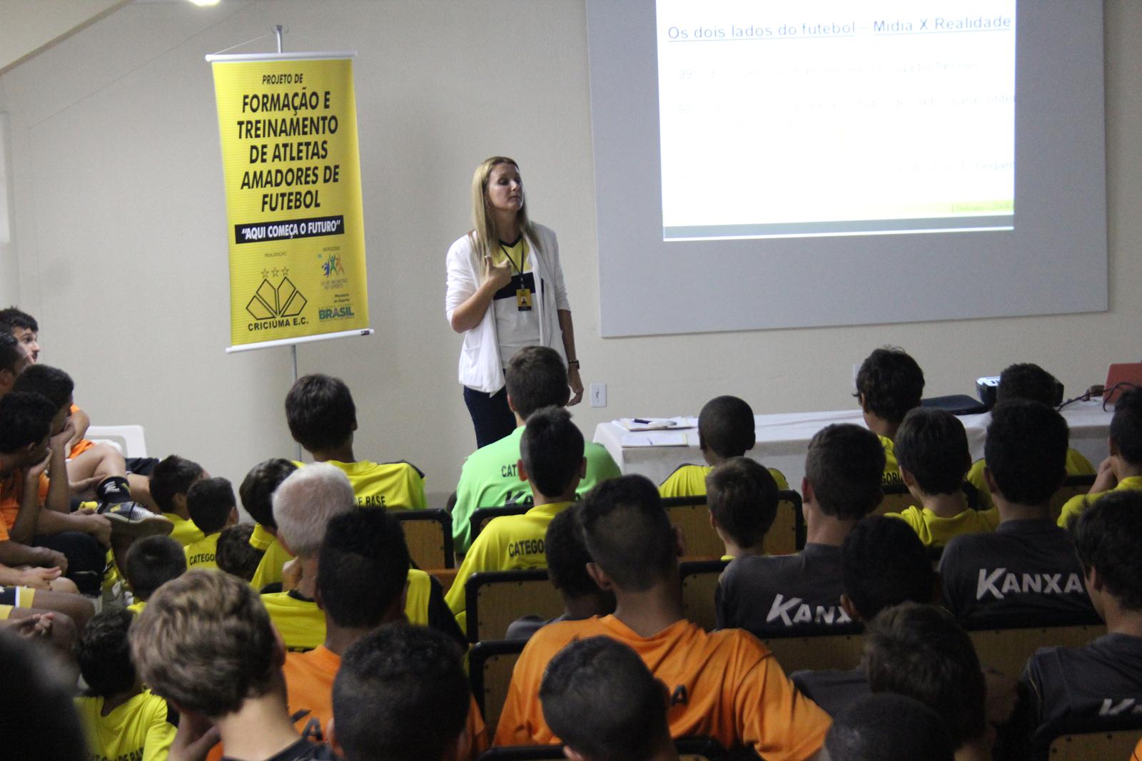 Os atletas das categorias de base do Criciúma, beneficiados pelo do Projeto de Treinamento de Atletas Amadores de Futebol, do Ministério do Esporte através de recursos da Lei de Incentivo ao Esporte, participaram no início da tarde desta segunda-feira (17/03) de palestra no auditório do estádio Heriberto Hülse sobre a educação.