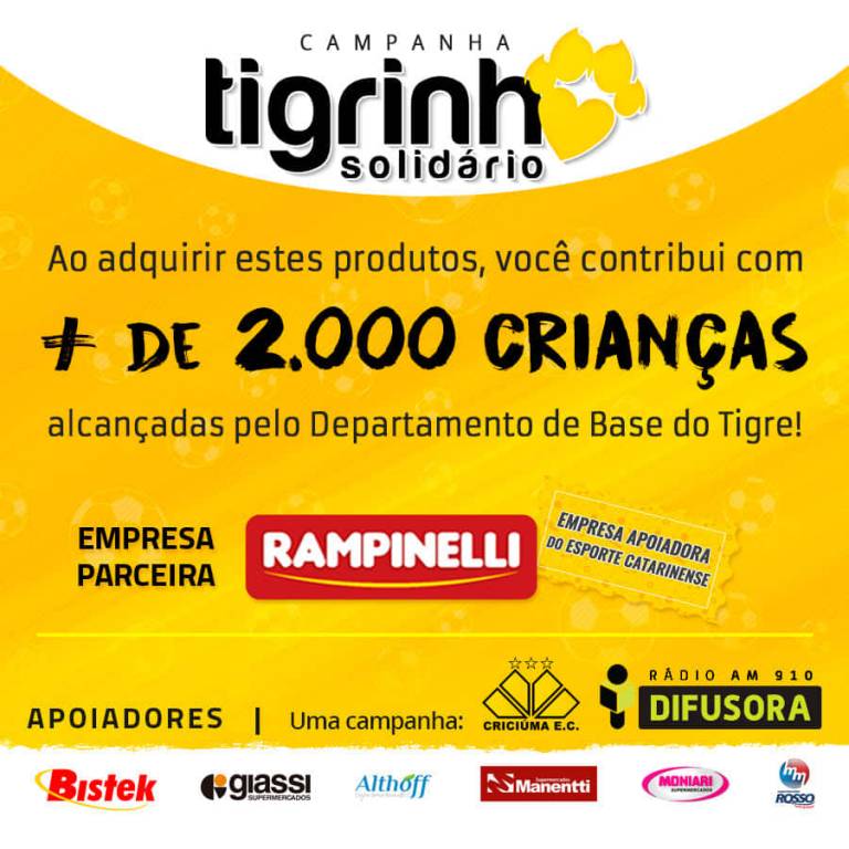 Ao adquirir produtos da marca Rampinelli nos supermercados parceiros da campanha você estará contribuindo com mais de duas mil crianças alcançadas por projetos e atividades das categorias de base do Tigre. Atualmente, a base carvoeira oferece atividades para atletas de toda a região sul-catarinense, e disponibiliza alimentação, transporte escolar e alojamento para aproximadamente 90 meninos e meninas além de ser parceiro de 20 municípios e da Unesc no projeto Tigrinhos.