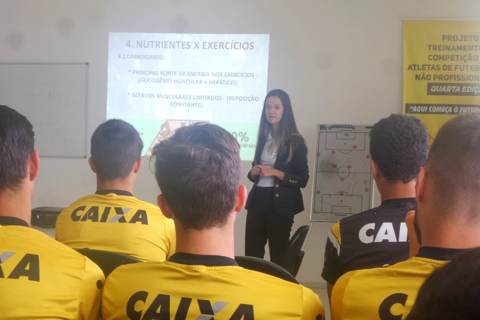 Os atletas da categoria Sub-20 do Criciúma participaram de uma palestra na tarde desta terça-feira (08/08), no auditório do Centro de Treinamento, no bairro Cristo Redentor. A nutricionista do clube, Lygia Angulski, conversou com os jogadores sobre a importância de uma boa alimentação para o alto desempenho nos treinos e jogos.