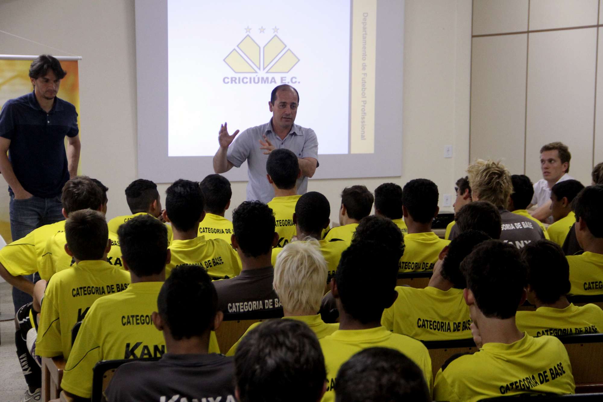 O zagueiro do Criciúma disputou 37 das 38 partidas no Campeonato Brasileiro da Série B de 2012 e este ano, jogou os 35 jogos que o time fez na temporada. O atual capitão do Tigre foi assistido pelos garotos do infantil e juvenil do Tricolor e ao final da palestra ganhou um brinde das mãos do diretor executivo da base, Idemar Ângelo Tomasi, o Sarandi.