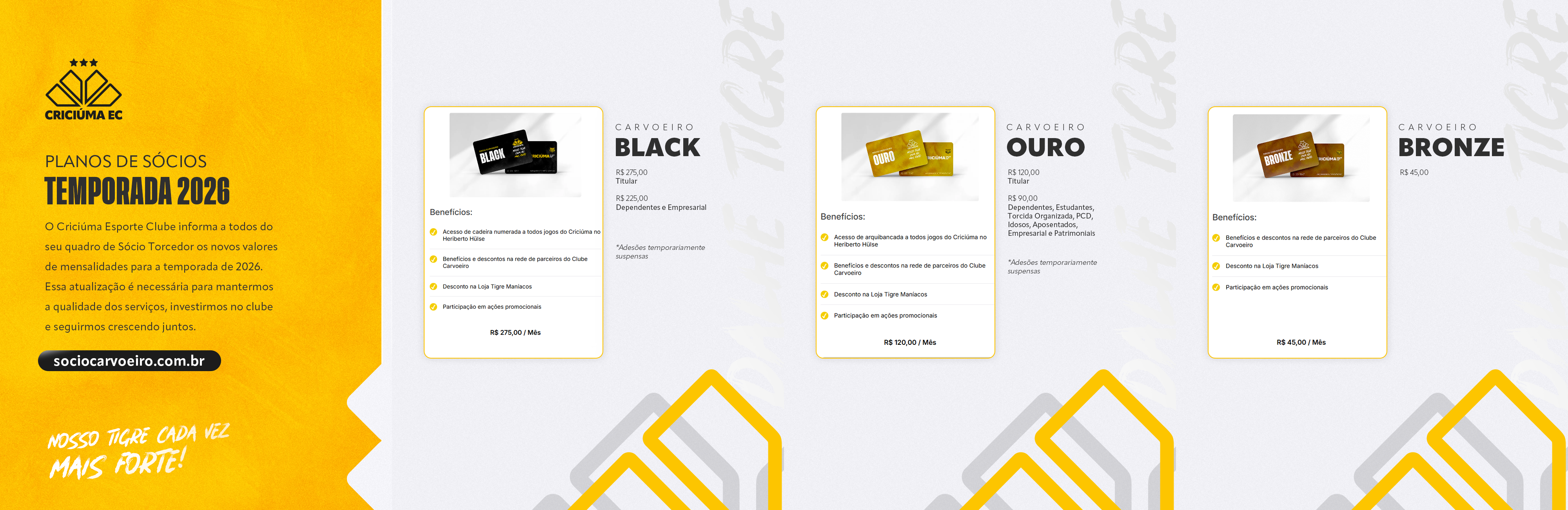 O Criciúma Esporte Clube informa a todos do seu quadro de Sócio Torcedor os novos valores de mensalidades para a temporada de 2026. Essa atualização é necessária para mantermos a qualidade dos serviços, investirmos no clube e seguirmos crescendo juntos.
