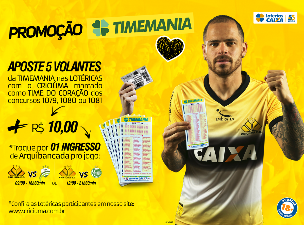 Ao ir à lotérica e fazer 5 apostas da Timemania, entre os concursos 1079, 1080 ou 1081, o torcedor poderá comprar diretamente no estabelecimento um ingresso de arquibancada ao valor de R$ 10,00 para um dos jogos.
