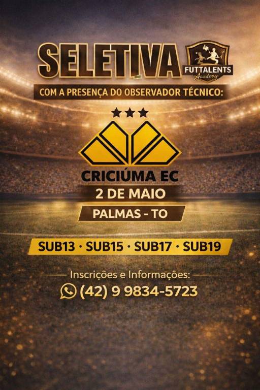 O Criciúma realizará uma avaliação para as suas divisões de base em Palmas (TO). No dia 2 de maio ocorre uma seletiva para novos atletas do Tigre para as categorias de Sub-13 a Sub-19. O observador técnico da base carvoeira, Benevan Ribeiro, estará presente acompanhando os testes.