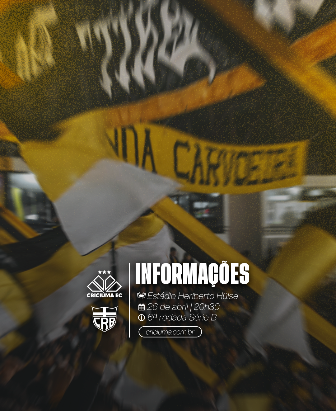 Nesse domingo (26/04), o Criciúma enfrenta o CRB, pela 6ª rodada do Campeonato Brasileiro Série B. A partida começará às 20h30min, com a abertura dos portões programada para às 18h30min. O ingresso de arquibancada, para os torcedores do Criciúma e do CRB, inteiro, custa R$ 120,00, enquanto a meia-entrada custa R$ 60,00 (válida para estudantes, pessoas com deficiência, idosos acima de 60 anos, entre outros, mediante comprovação conforme a legislação).