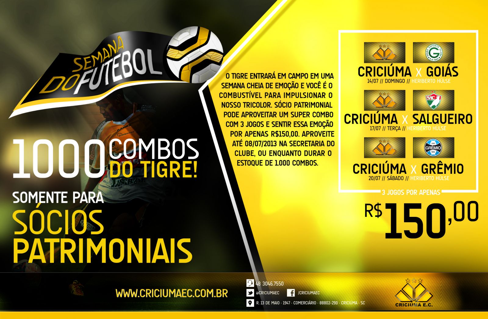 O Criciúma está lançando uma grande promoção para os Sócios Patrimoniais. No mês de julho o Tigre fará três jogos em casa e para não deixar ninguém de fora, o clube está disponibilizando um Combo. O Sócio Patrimonial que quiser adquirir ingresso para os jogos contra Goiás, Salgueiro e Grêmio, poderá pagar R$ 150,00.