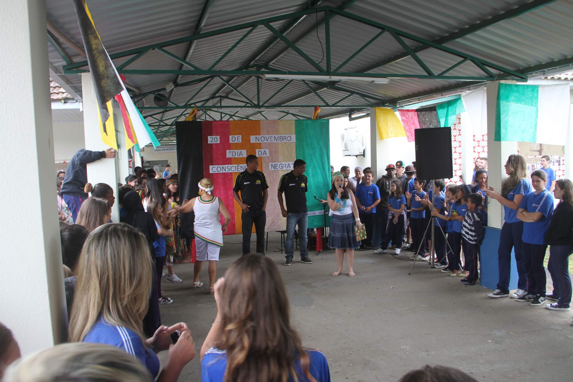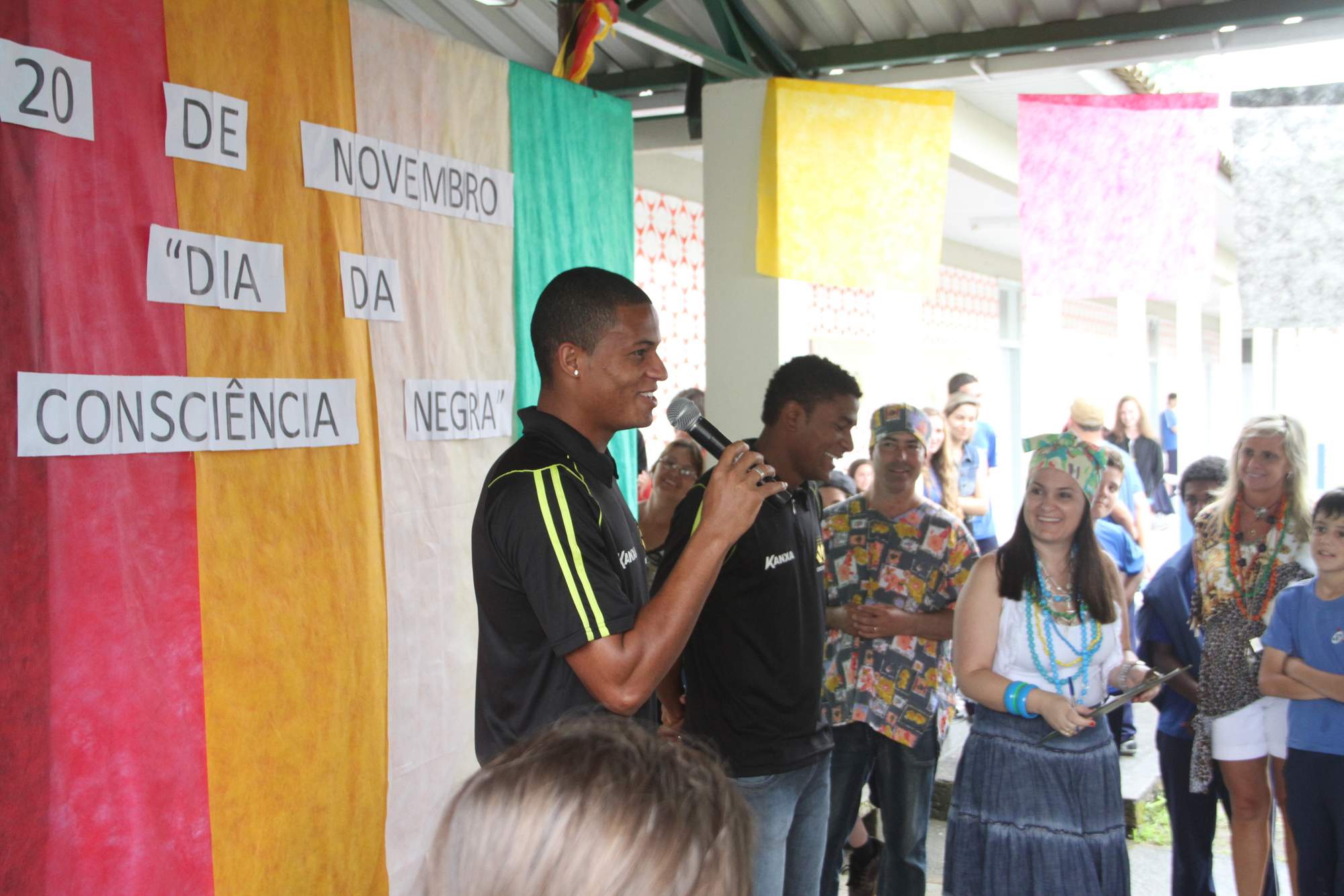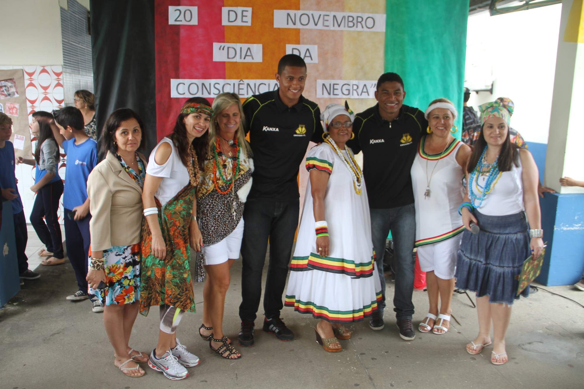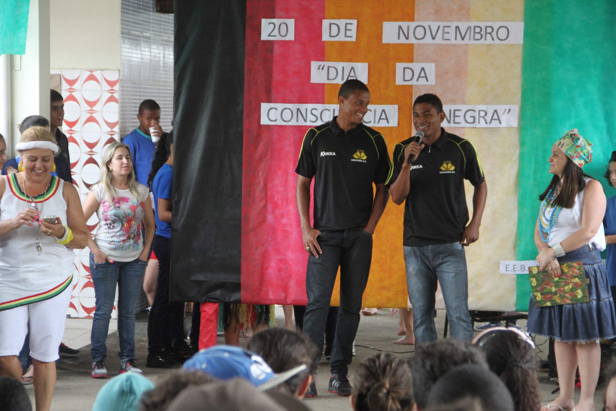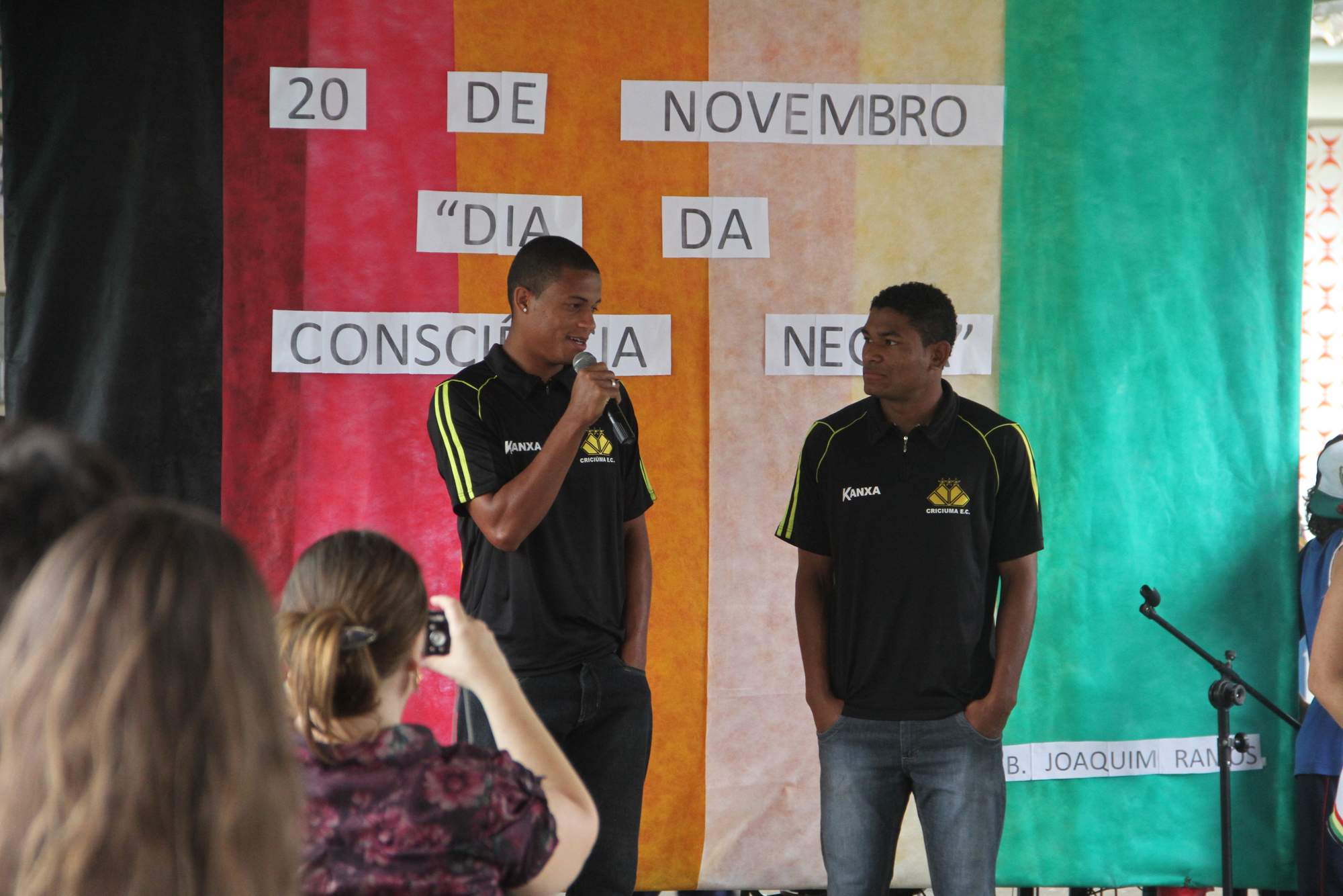 Em comemoração ao Dia da Consciência Negra, a Escola de Educação Básica Joaquim Ramos, de Criciúma, fez uma série de atividades na manhã desta quarta-feira (20/11). Além de apresentações de danças e contos históricos, os jogadores do Criciúma, Henik e Joílson, compareceram e conversaram com as crianças.