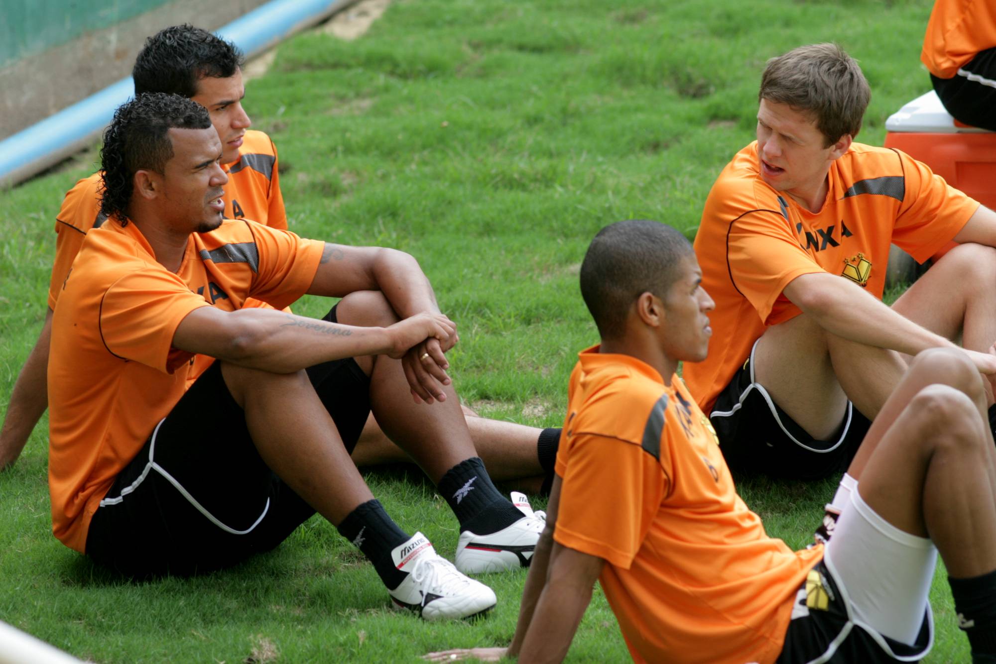 Legenda: Trabalho de avaliação fìsica na tarde desta sexta-feira (05/01) no estádio Heriberto Hülse. Na foto, o goleiro Bruno, o atacante Zé Carlos, o zagueiro Joílson e o lateral direito Ezequiel