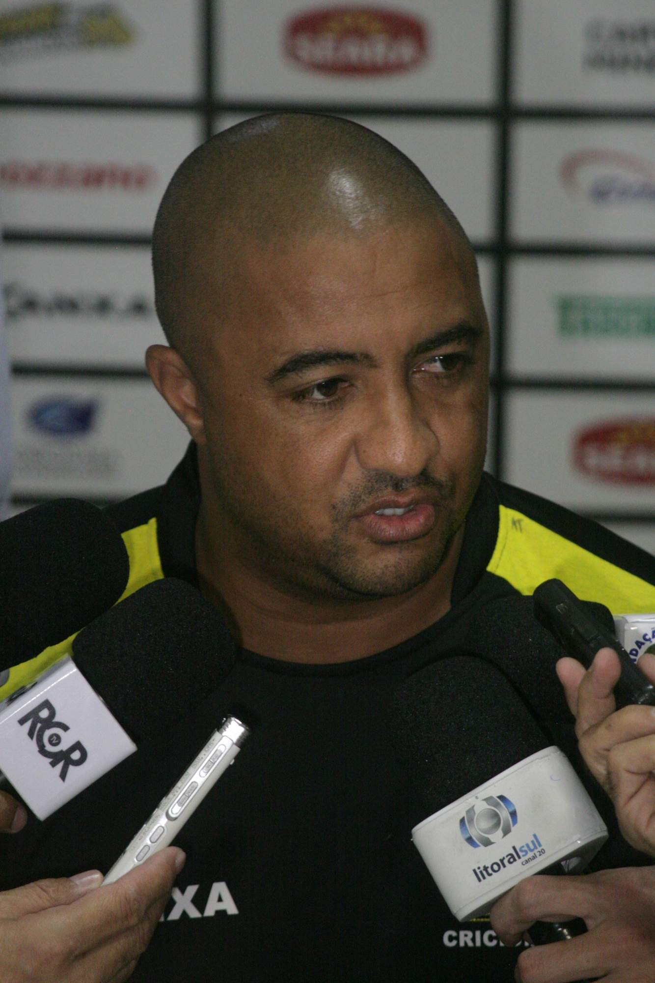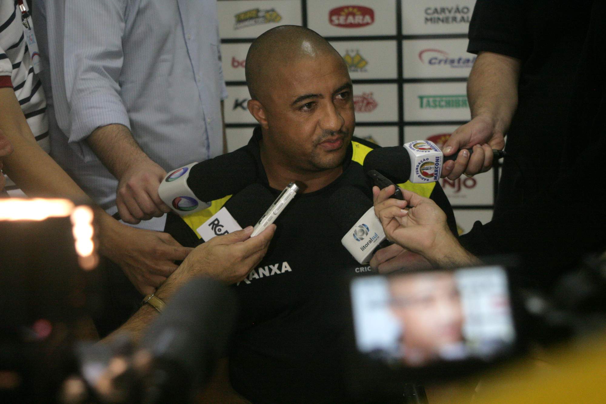 Legenda: Entrevista coletiva com o auxiliar técnico Vaguinho, na sala de imprensa do estádio Heriberto Hülse, na tarde desta quinta-feira (14/03)
