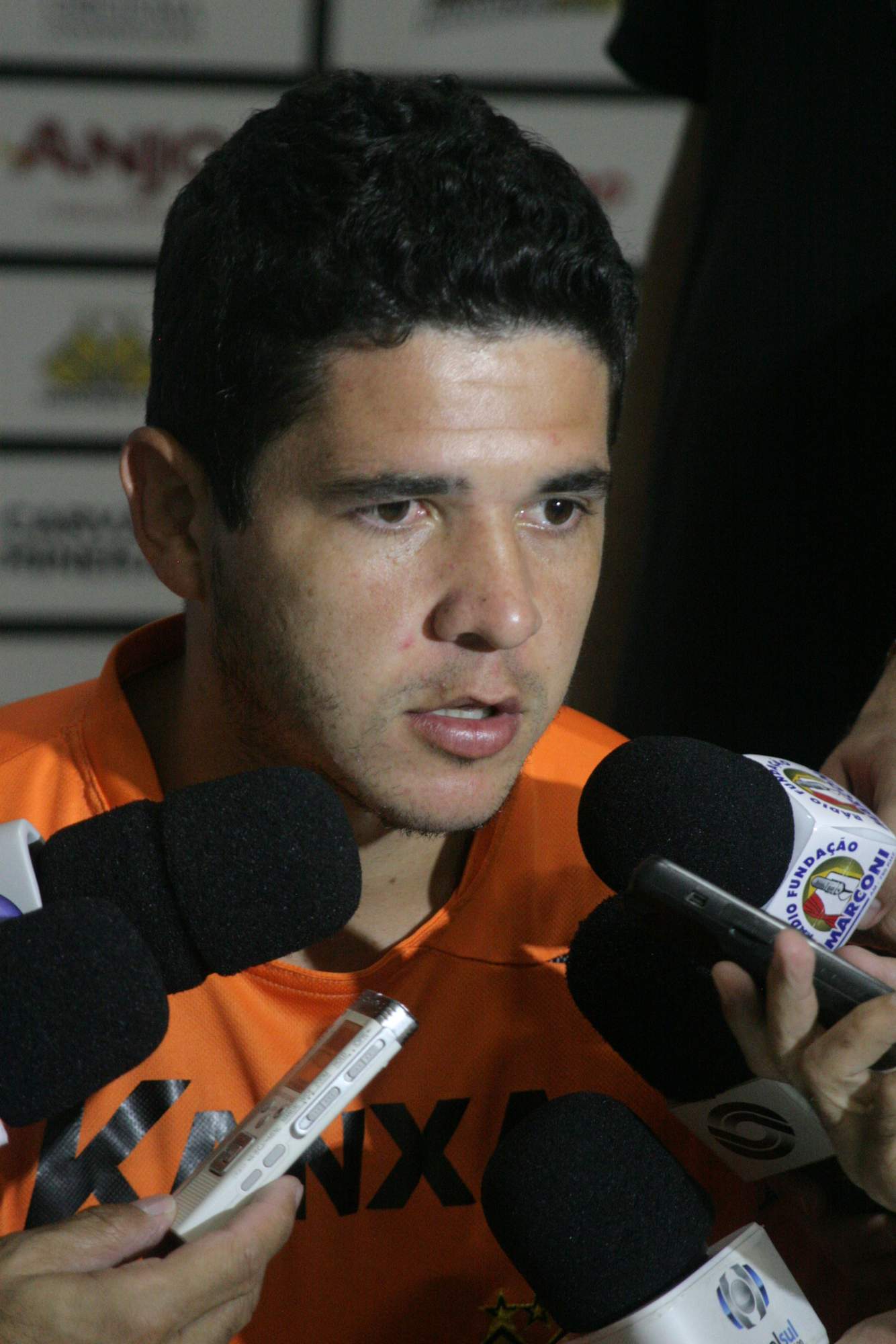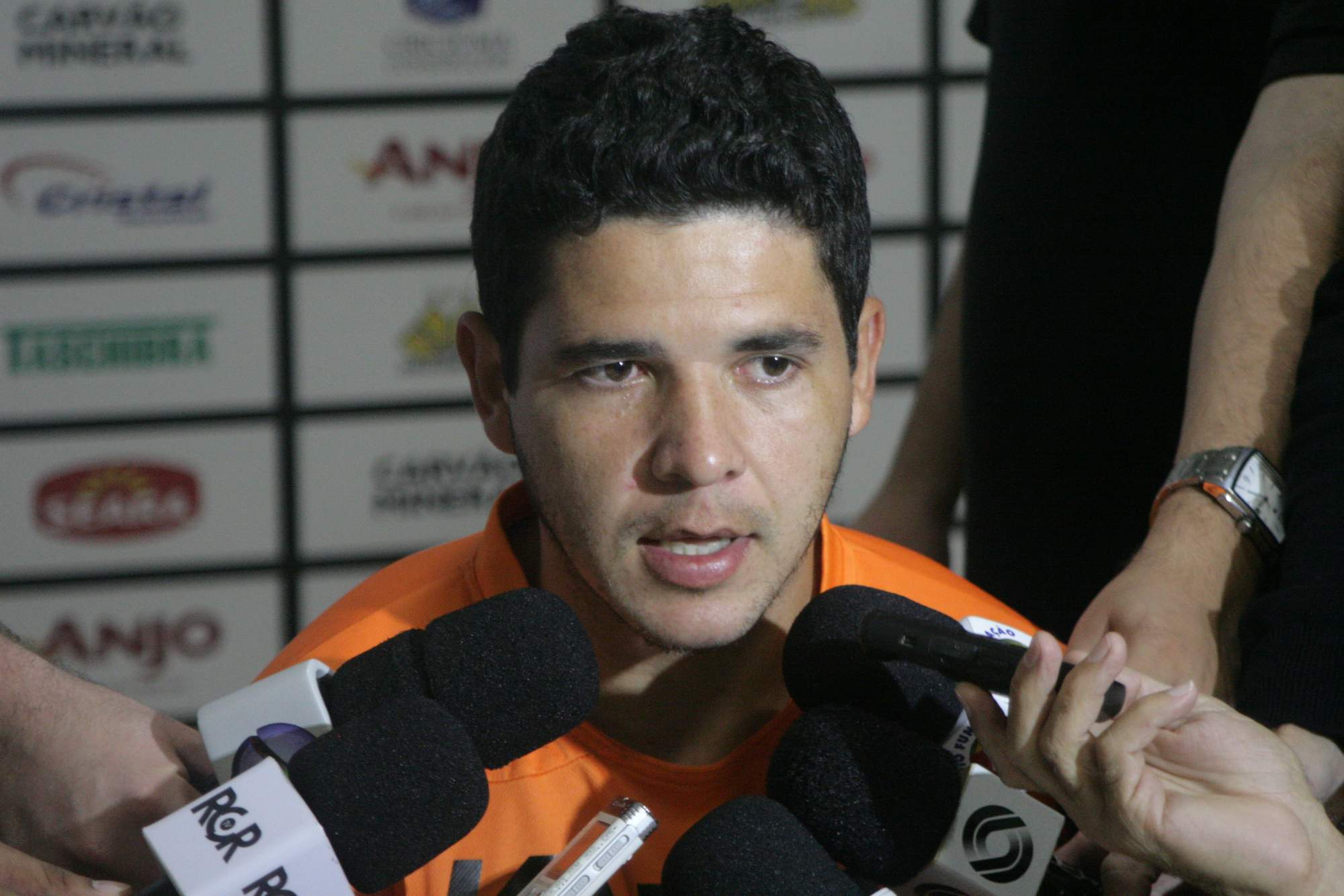 Legenda: Entrevista coletiva com o lateral direito Diego Renan, na sala de imprensa do estádio Heriberto Hülse, na tarde desta quinta-feira (14/03)