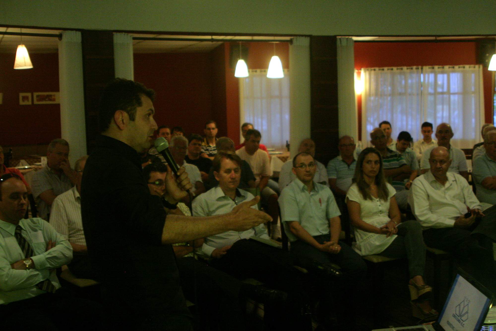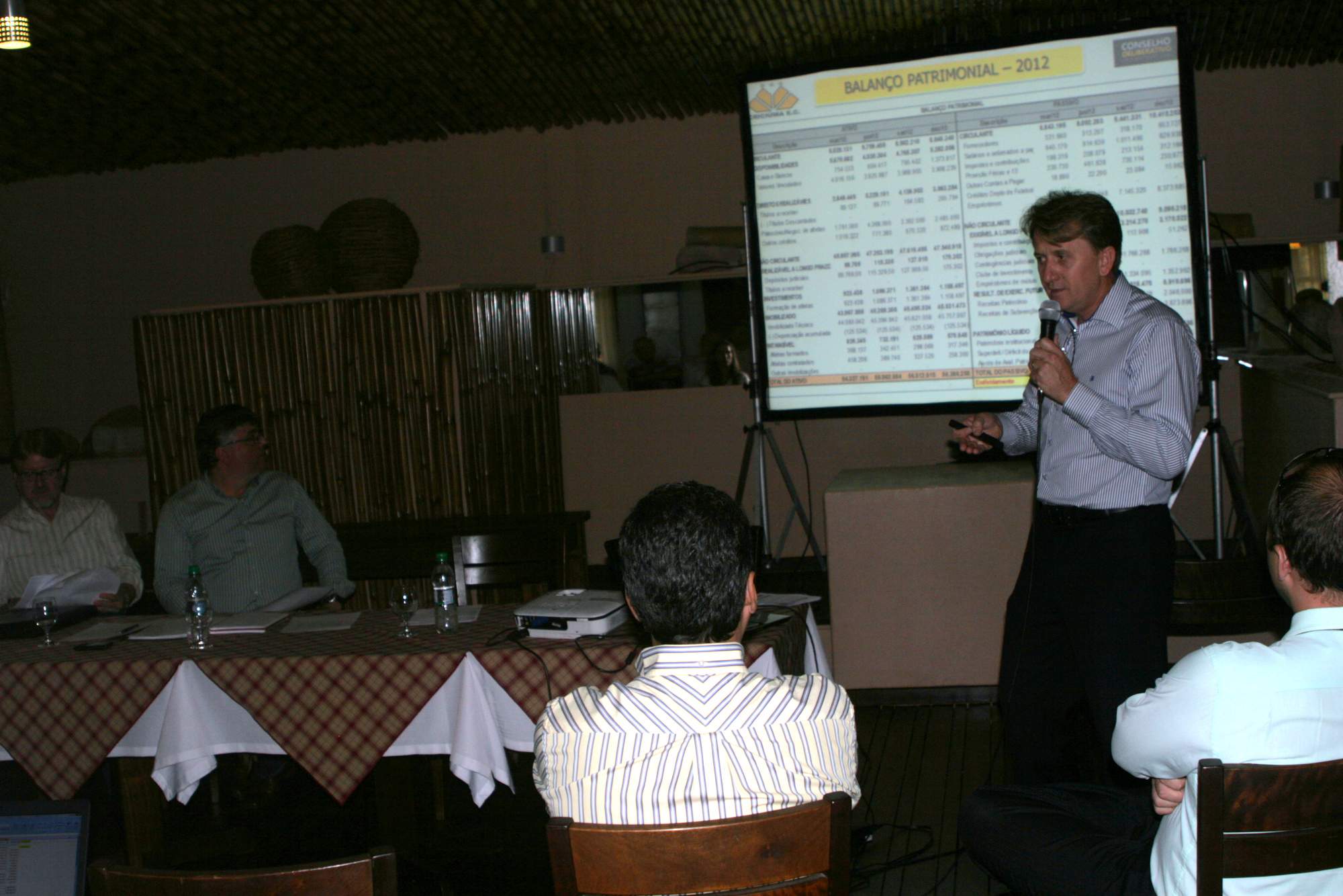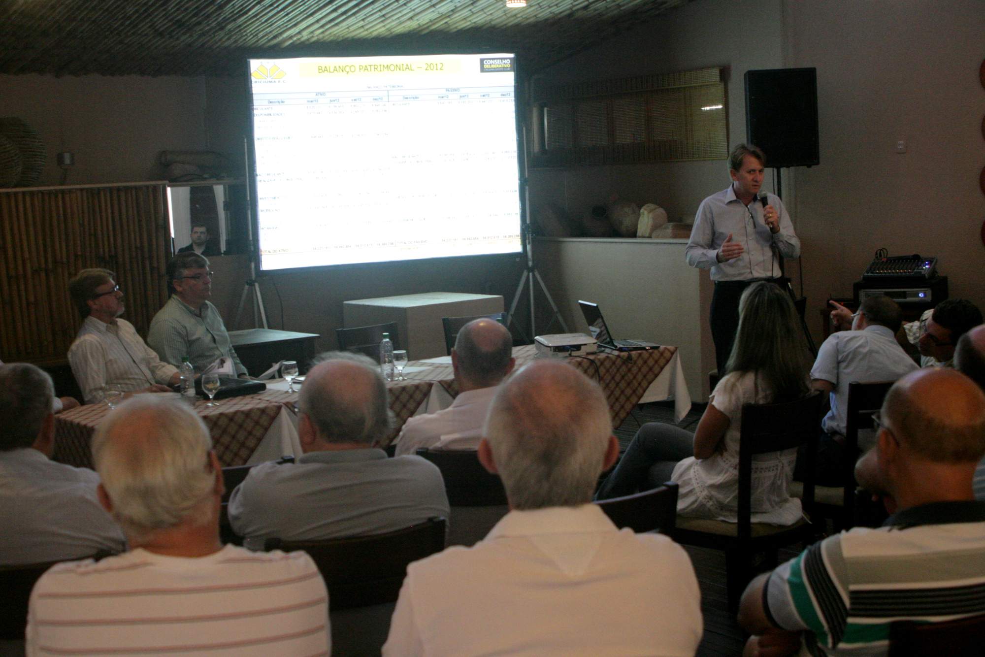 Legenda: Reunião do Conselho Deliberativo do Criciúma Esporte Clube ocorreu na noite desta quarta-feira (16/01) no Centro de Eventos Oasis. Na foto, o vice presidente financeiro Aílton Schuelter, apresenta o orçamento 2013