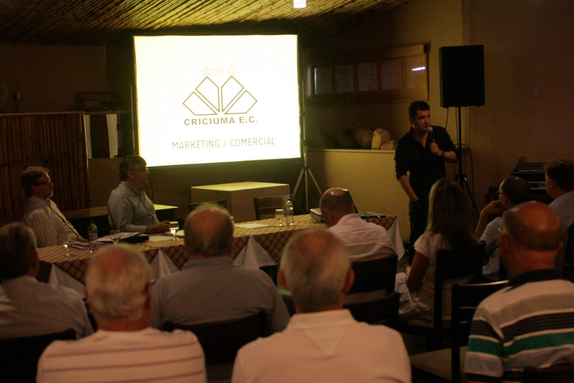 Legenda: Reunião do Conselho Deliberativo do Criciúma Esporte Clube ocorreu na noite desta quarta-feira (16/01) no Centro de Eventos Oasis. Na foto, o diretor comercial e de marketing, Cláudio Gomes, apresenta nos planos de sócios